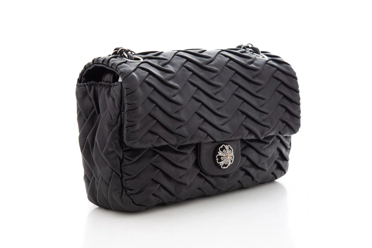 Chanel 2008 Black Lambskin Pleated Leather Single Flap Handbag
