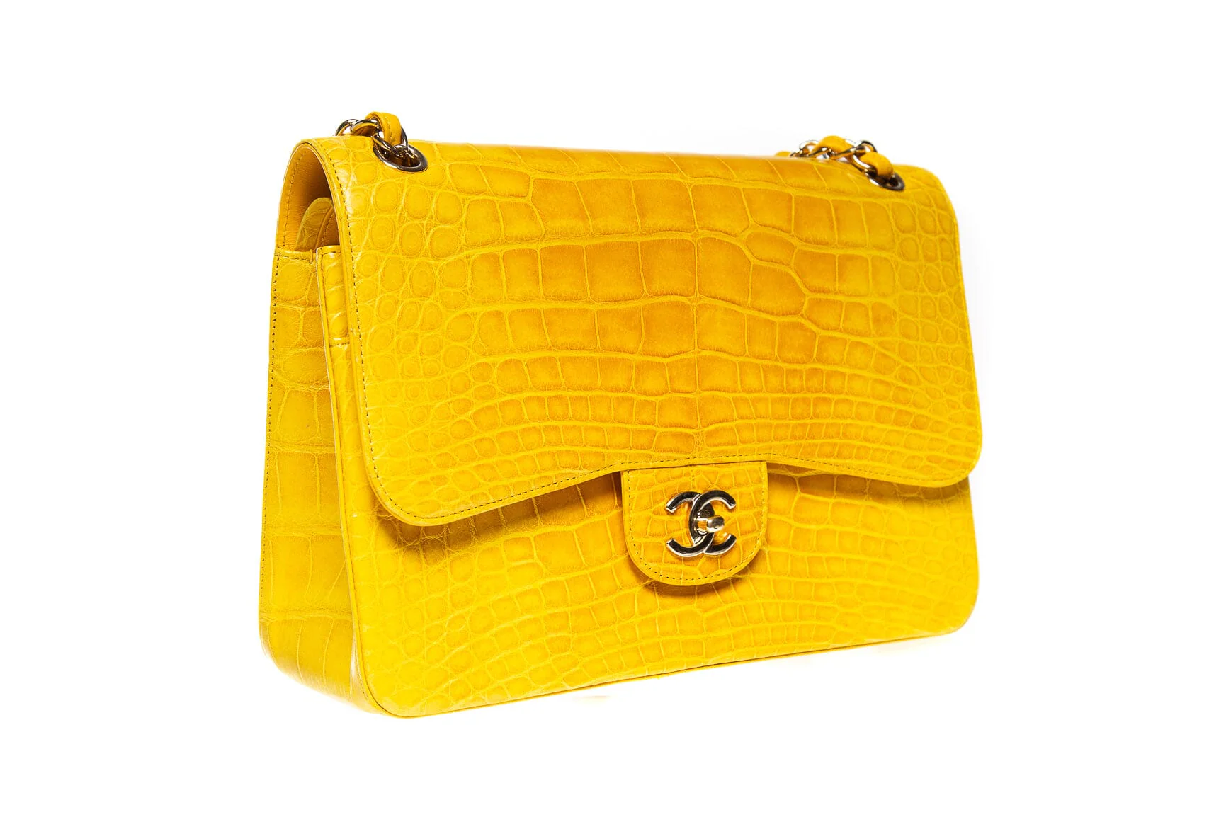 Chanel Shiny Yellow Alligator Skin Jumbo Double Flap Handbag