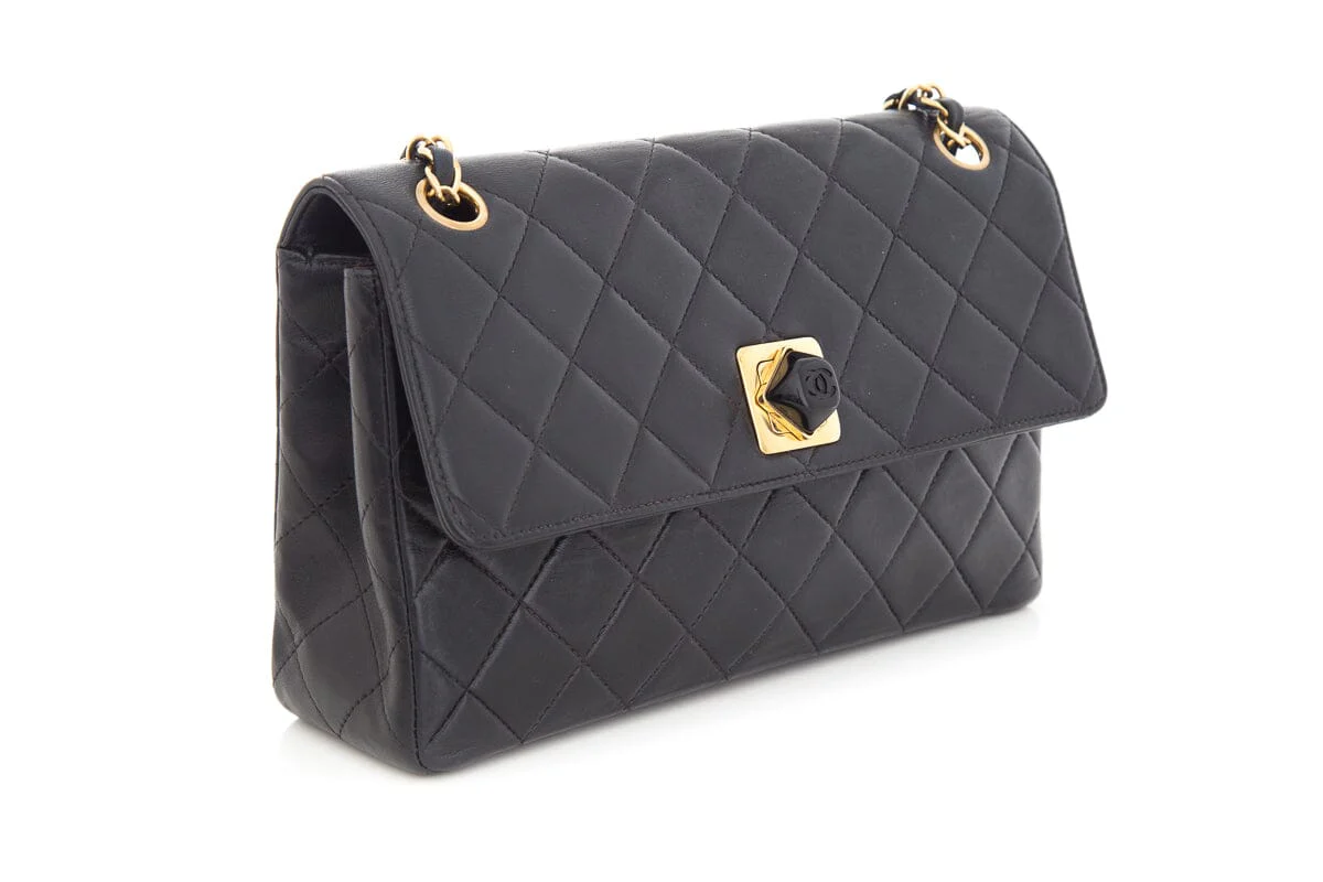 Chanel 1999 Black Quilted Medium Lambskin Flapbag Handbag with Turn Lock Closure. This item is vintage and in good condition.