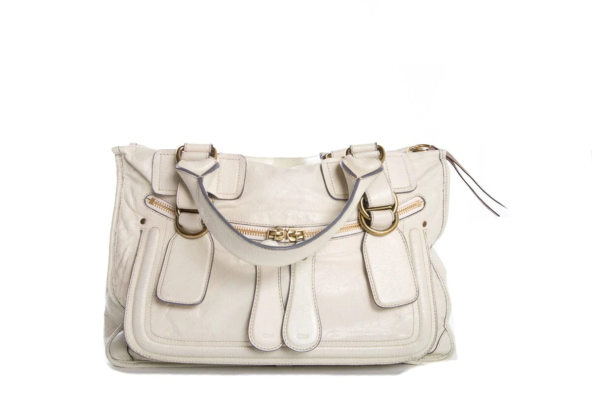 Chloé ivory handbag with dual top handles, gold-tone hardware, multiple zip compartments at exterior, light beige lining at interior & single zip closure pocket at interior. This item is in good condition with some signs of wear. Wear includes scratching to hardware, light scuffing to edges and creasing throughout