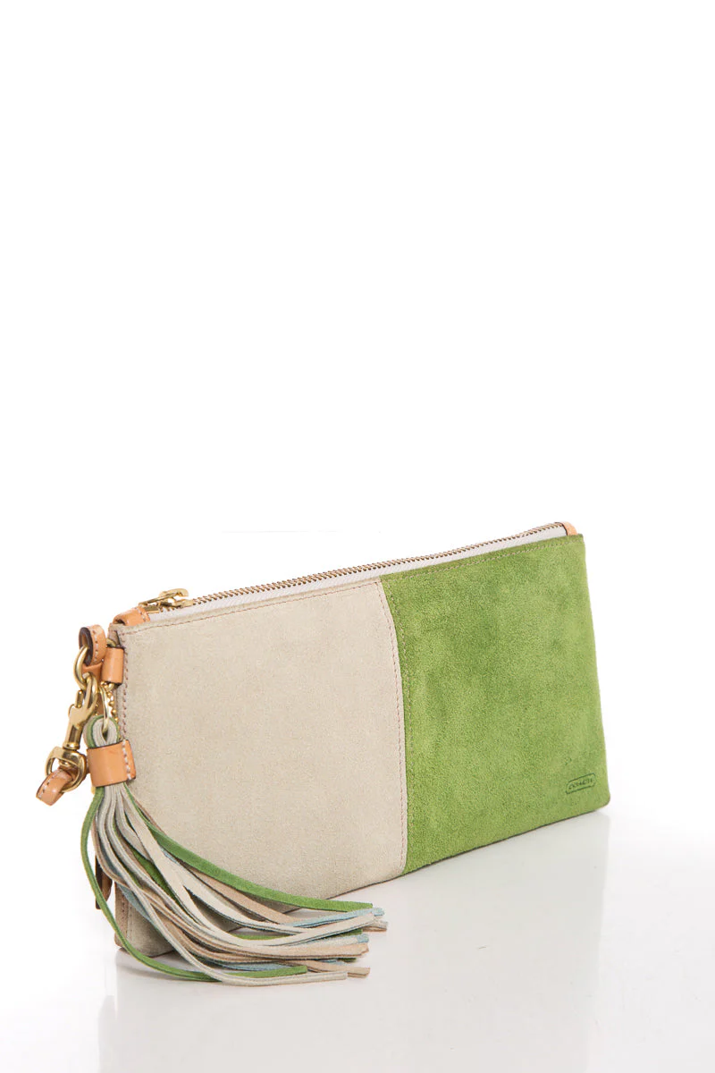 Coach color block suede hand bag with zipper closure at top and fringe tassel detail. This item is in good condition with some slight discoloring on corners.