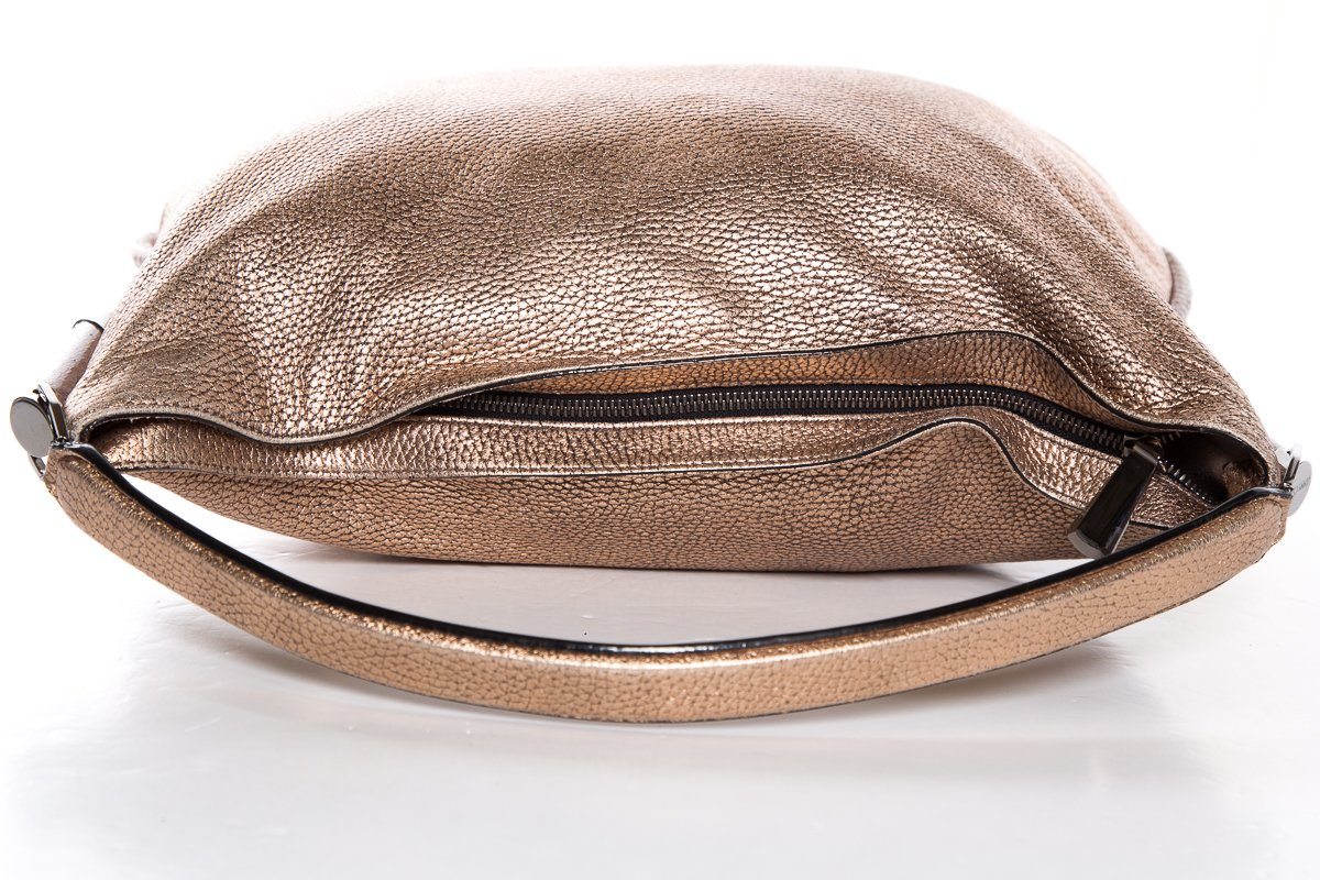 Jimmy Choo champagne metallic pebbled leather shoulder bag with single flat top handle, tonal stitching, python trim, contrast edge paint, gunmetal-tone hardware, suede lining and top zip closure.