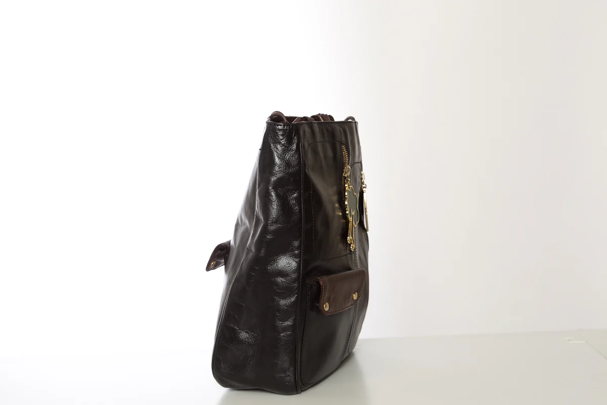 Black small Tote with Brown handles, with charm and zipper detailing. Item is in Very Good Condition; Contains Slight staining on lining.